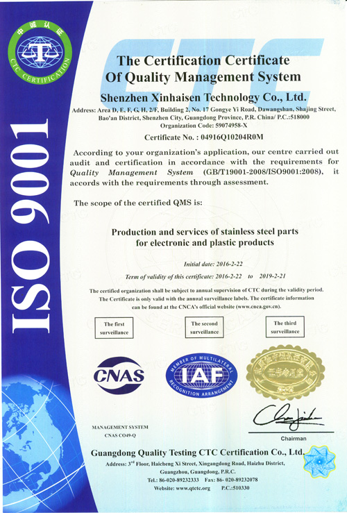 深圳市鑫海森科技有限公司成立于2006年,坐落于中國廣東省深圳市沙井鎮,地理位置優越,對于我司原物料采購及協作加工有無法比擬的迅速性和高品質性。 我司主要進行精密五金件的加工,產品涉及的范圍相當廣泛,涵蓋了通訊、聲學、光學、醫療、安防、機械、航空、陸運工具、家電等等領域。本公司目前產能1000^2全自動生產線6條。加工厚度從0.02mm-1.5mm產品的精度可以做到... 【查看詳情】